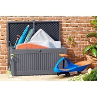 Multiple options: This garden storage box is available in two options – 270 L, or 490 L. Easy assembly and use: With straightforward construction and backed by a 12-month guarantee, this garden storage solution offers hassle-free setup and reliable performance. Weatherproof and durable: Crafted from sturdy polypropylene, this grey storage box ensures your belongings remain safe and dry, even in harsh weather conditions. Effortless storage and seating: The Lockable Garden Storage with a Sit-On Lid provides a convenient 270-litre or 490-litre capacity for your outdoor items and doubles as practical garden seating. Secure and spacious: Featuring a reinforced hinged lid and multiple capacities, this storage box keeps your cushions, tools, and other essentials organised and protected.