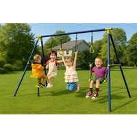 Room for Four – Accommodates up to four children at once for group fun Adjustable Height – Swing rope adapts to your child’s growth for lasting use 3-in-1 Play Options – Includes swing seat, glider for two, and gym rings for active variety Sturdy Steel Frame – Powder-coated finish provides safety and weather resistance For Ages 3-12 – Designed to engage a wide age range, perfect for growing families Quick Assembly – Simple setup means more time playing outdoors Secure Ground Stakes – Four included stakes keep the set firmly anchored