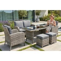Anti-Rust Metal Frame: Durable support in all seasons. 6-Seater Set: Seats up to six with sofa, armchairs, and stools. Modern Design: Elevates patios, gardens, or decking areas. Plush Cushions: Thick, shower-resistant and machine washable. Weather-Resistant Rattan: Built for year-round outdoor use. Tempered Glass Table: 5mm glass top for easy cleaning. Quick Assembly: Flat-packed for simple 40-minute setup. Low Maintenance: Wipe clean and cover when not in use.