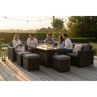 Weather-Resistant Rattan: Choose between durable grey or black finishes. Plush Cushions Included: Grey seat, back, and foot cushions for every spot. Integrated Fire Pit Table: Dine al fresco and enjoy built-in warmth. Optional Rain Cover: Keep your set protected year-round. Multiple Accessories: Includes matching stools for flexible seating. Delivered Flat-Packed: Four manageable boxes for easy home assembly. Seats up to 9: Host large gatherings with comfort and style. Fixed Corner Design: Configure as shown—no guesswork. Simple Care: Removable cushions make cleaning easy.