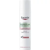 Eucerin Dermopure Triple Effect Triple Action Serum targets blemishes, oil and post-inflammatory acne marks. Features: Thiamidol, salicylic acid, licochalcone A and sebum-regulating technology for anti-blemish, anti-oily, anti-redness and mattifying action.Reduces imperfections.Regulates excessive oiliness.Reduces post-inflammatory acne marks.Eliminates and prevents pigmentation spots.With a long-lasting matte finish.Ideal for acne-prone skin.More even and mattified skin.Directions for use: Apply morning and evening to the entire face. Avoid the eye contour.Shop Online Eucerin Dermopure Oil Control Triple Effect Serum 40ml at best price. Product features: – Treatments: Dark Spot Treatment, Anti Redness, Mattifying and Purifying, Anti-acne, Sebum Regulator- Textures: Serum- Skin Type: Acneic, Damaged/Irritated Skin