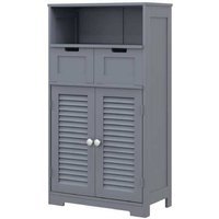 Easy Assembly: Clear instructions included. Adjustable Shelf: Customise storage with three height options. Durable MDF Build: Long-lasting and sturdy for everyday use. Multi-Function Storage: Open shelf, two drawers, and double-door cupboard. Space-Saving Design: Compact freestanding unit fits most bathrooms. Anti-Tipping Straps: Enhanced safety for family homes. Stylish Grey Finish: Modern look suits any bathroom decor. Max Load: Holds up to 55kg. Louvred Doors: Promote airflow to keep items fresh.
