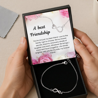 Adjustable Fit: Comfortable for most wrist sizes. Cubic Zirconia Accents: Sparkling stones add elegance. Rhodium Plated: Durable finish for lasting shine. Gift-Ready Packaging: Includes jewellery box and heartfelt message card. Symbolic Design: Infinity charm celebrates lifelong friendship.