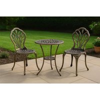 High weight capacity: Table supports up to 40kg; chairs up to 120kg. Charming bistro set: A 3-piece aluminium garden set with a table and two floral-design chairs, perfect for intimate outdoor moments. Lightweight & portable: Easy to move around your garden or balcony for the perfect spot. Quick home assembly: Flat packed for your convenience. Elegant floral design: Instantly enhances any garden or patio. Weather-resistant aluminium: Enjoy rust-free durability, year-round. Space-saving 2-seater: Ideal for balconies, patios, and cosy outdoor spots. Comfortable seating: Ergonomically designed chairs with supportive backs for relaxed dining. Central parasol hole: Add shade for sunny lunches. Low maintenance: Easy-clean powder-coated finish.
