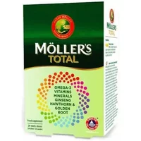 Mollers Total 28 Capsules is a multivitamin rich in vitamins, minerals, omega-3 and enriched with ginseng extract. It helps to reduce tiredness and fatigue and to keep your immune system, heart and brain healthy. Möllers total comes in an easy-to-use format, 4 blister packs with the days of the week engraved on them, making it easy to remember if you have taken your daily dose. The daily dose of Möllers Total consists of one capsule (containing omega-3 fish oil rich in DHA and EPA) and one tablet (containing vitamins, minerals and ginseng extract). These nutritional substances are key to the proper functioning of the body and help maintain overall good health. The unique composition of the ingredients has been designed by Scandinavian specialists. It is a perfect preparation for people who lead an active and intensive lifestyle, are affected by a high level of stress or experience physical and mental fatigue.It contains the essential omega-3 fatty acids EPA and DHA, which support normal heart function. While DHA also supports brain and eye function. The multivitamin tablet contains a range of vitamins and minerals, including vitamins A, D, C, B6, B12 and selenium, which support a normal, healthy immune system. Magnesium, iron, niacin, riboflavin, vitamin B6 and B12 contribute to the reduction of tiredness and fatigue. Selenium, vitamins C and E help protect the body’s cells from oxidative stress. Vitamin D supports the maintenance of normal bones and teeth.High-quality ginseng extract is standardised with a high content of active ingredients: 8% ginsenosides. Ginseng, also known as “root of life”, is a natural strengthening ingredient and has been known in Asia for over 1000 years. The invigorating activity of ginseng is well documented in scientific research.The almond shape makes the tablet easy to swallow. The shape has been designed in cooperation with the Danish Technological Institute and is documented in the latest scientific research.The product cannot be used as a substitute for a balanced diet. A balanced diet and a healthy lifestyle are essential for the proper functioning of your body.Shop Online Möller’s Total Multivitamins + Omega-3 (28 Tablets + 28 Pearls) at best price. Product features: – SUPPLEMENTS: Antioxidants, Cholesterol