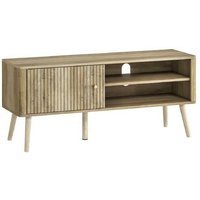 Robust Support: Solid pine legs and sturdy particle board construction. Cable Management: Built-in cable hole for tidy wires. Compact Design: Ideal for smaller spaces. Fits TVs up to 55″: Perfect for most living room setups. Easy Assembly: Simple to set up with clear instructions. Adjustable Shelving: Three-level open shelf adapts to your needs. Stylish Oak Finish: Warm wood-effect brings a modern touch. Dimensions: 115W x 35D x 49H cm. Hidden Storage: Concealed cupboard keeps clutter out of sight. Weight Capacity: Holds up to 52 kg.