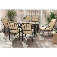 Weather resistant: Texteline and polyester seating withstand sun and rain. Easy assembly: Includes all fixings and instructions for quick setup. Spacious seating: Comfortably accommodates six people for gatherings. Weight support: Table holds up to 50kg; chairs up to 120kg each. Modern finish: Available in beige to suit your outdoor space. Complete set: Includes one large table and six high-back chairs for full outdoor dining. Garden dining set: Outsunny 7-piece set with glass-top table and six cushioned armchairs. Steel frame: Strong powder-coated structure for lasting outdoor durability. Umbrella hole: Table fits a 38mm parasol pole for optional shade. Padded comfort: Cushioned seats with armrests for relaxed, supported seating.