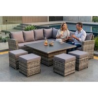 Optional rain cover: Extend the life of your furniture with a heavy‑duty Oxford fabric cover that resists tearing and abrasion, keeping your set protected through every season. Stylish finishes: Choose between modern grey or sleek black to complement your garden décor. Modern modular design: Arrange the corner sofas, stools, and table to suit your space – the flexible layout adapts easily for entertaining, lounging, or family dining. Lift-up aluminium table: Adjust the table height easily for dining, lounging, or entertaining outdoors. Luxurious cushions: Thick, soft seat and back cushions provide lasting comfort for long afternoons outside. Weatherproof rattan: Durable rattan construction ensures year-round use in unpredictable UK weather. What’s included: Create the ultimate outdoor lounge with a left-arm sofa, right-arm sofa, corner sofa, four stools, and a lift-up dining table – plus optional rain cover for added protection.