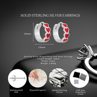 925 Sterling Silver: Made from high-quality sterling silver for lasting shine. Hinged Hoops: Easy-to-use secure fastening for comfort and peace of mind. Red Heart Charm: Adds a pop of colour and a romantic touch. Hypoallergenic: Safe for sensitive ears and everyday wear. Lightweight Design: Comfortable for all-day use. Versatile Size: 13mm hoops suit both daily and special occasions.