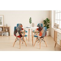 Durable Build: Sturdy materials and leg toppers protect your floors. Space-Saving Table: Round design fits neatly into kitchens or dining rooms. Easy to Clean: Smooth surfaces wipe clean in seconds. Seating for Four: Includes four comfortable, eye-catching chairs. Contemporary Design: Bright patchwork chairs paired with a crisp white round table. Quick Assembly: Simple instructions included for fast setup.